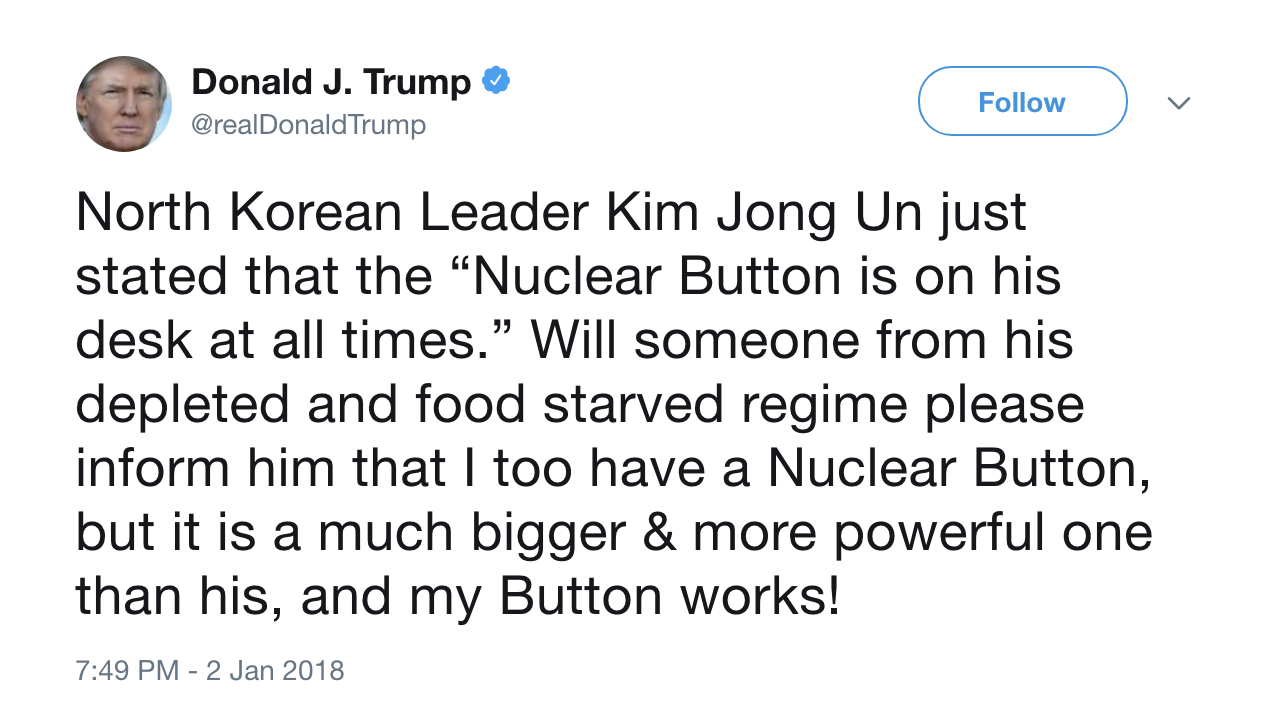 Donald Trump is threatening NUCLEAR WAR on his Twitter account.